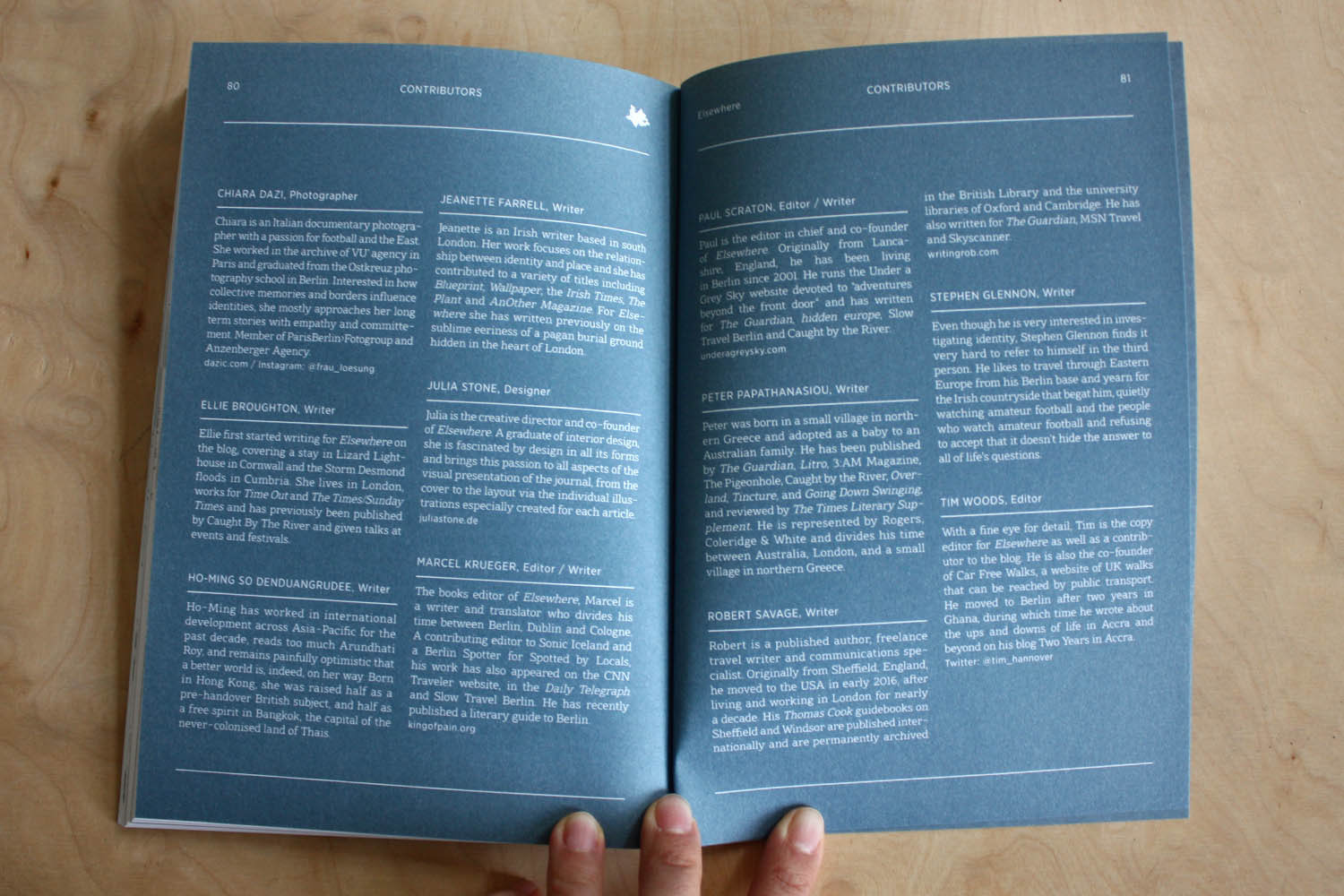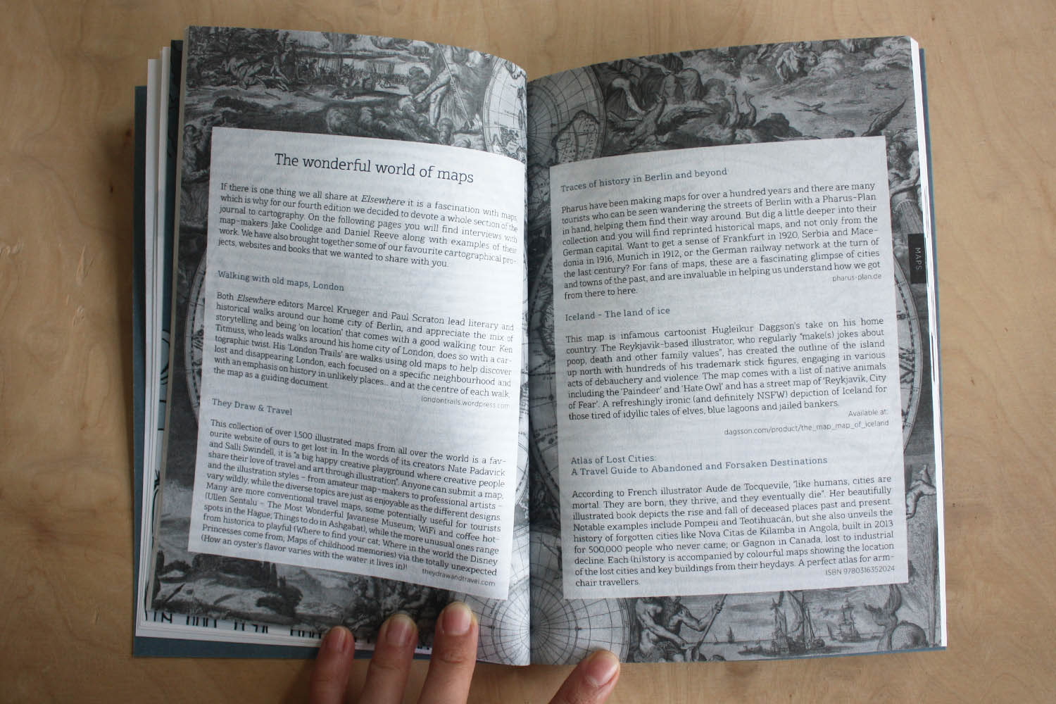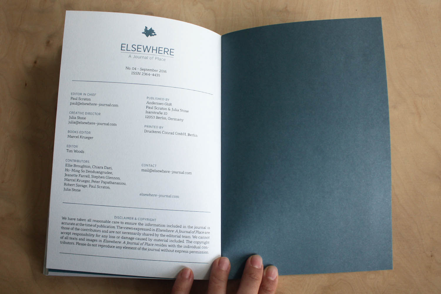 Alongside the print journal, we also maintained a website with place-related content from international contributors. After five print issues and a lot of gained experience but without financial success, Paul and I ended publishing the journal. The website, which was a large archive of interesting content by then, was kept running. Luckily and thankfully, former Elsewhere contributors Anna Evans and Marcel Krueger eventually took over and continue curating great content: elsewhere-journal.com