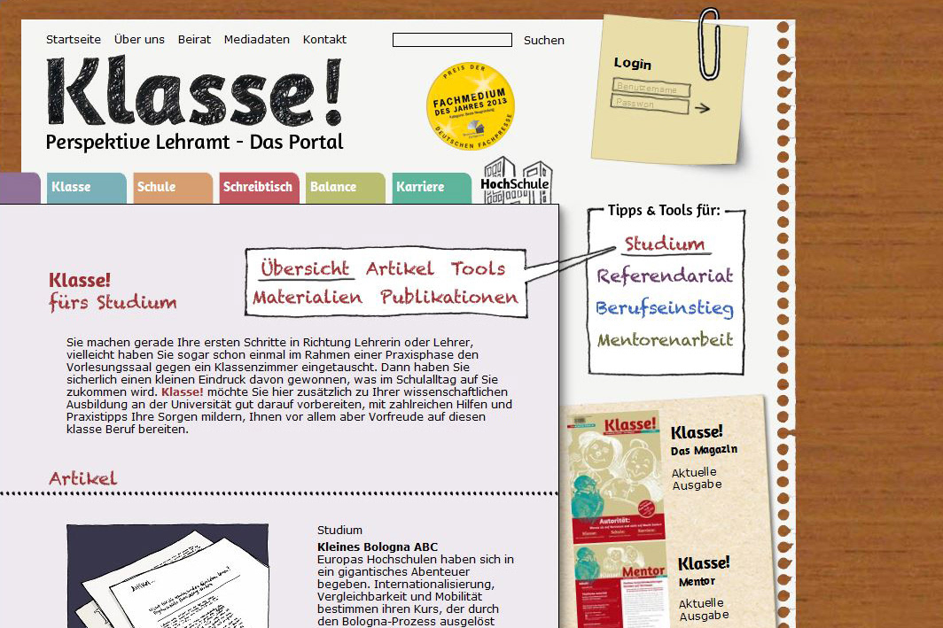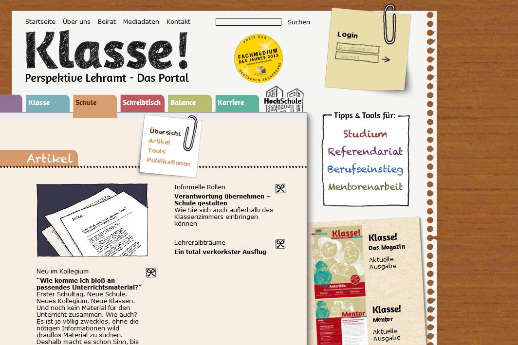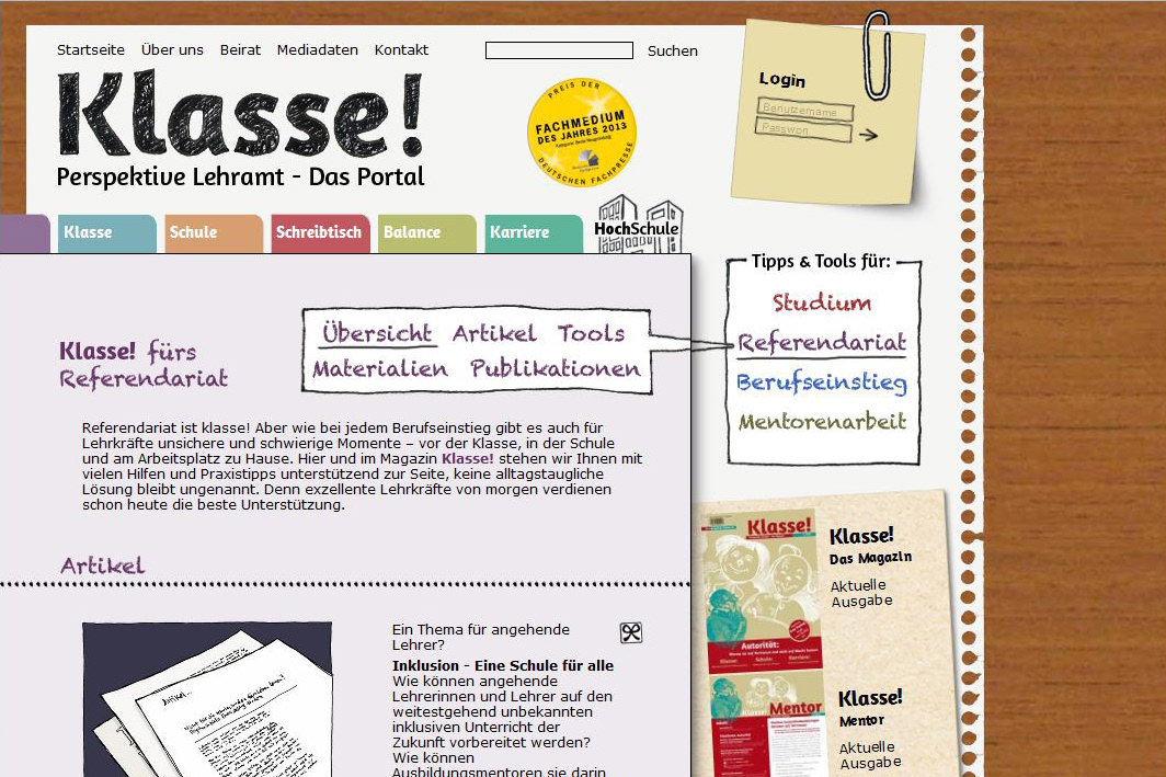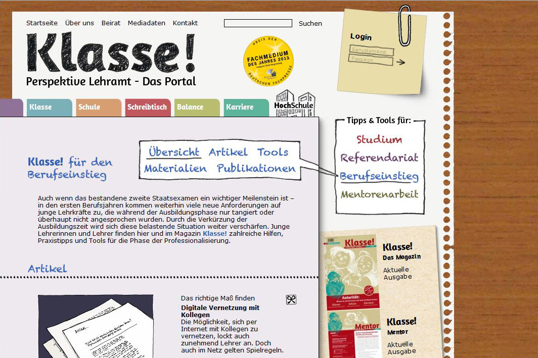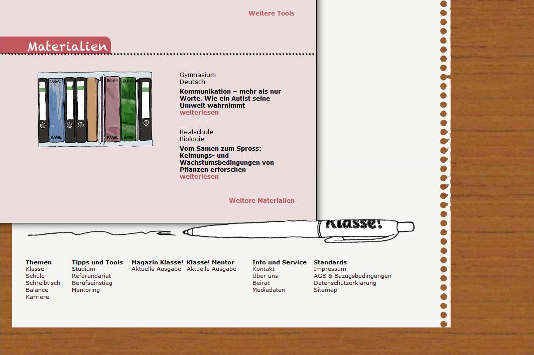 Web design and illustrations for “Klasse! Perspektive Lehramt”, a platform that offers professional information and educational material for prospective and young teachers as well as for their mentors. Publisher: Dr. Josef Raabe Verlags-GmbH.