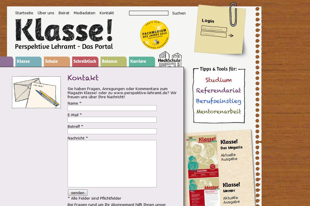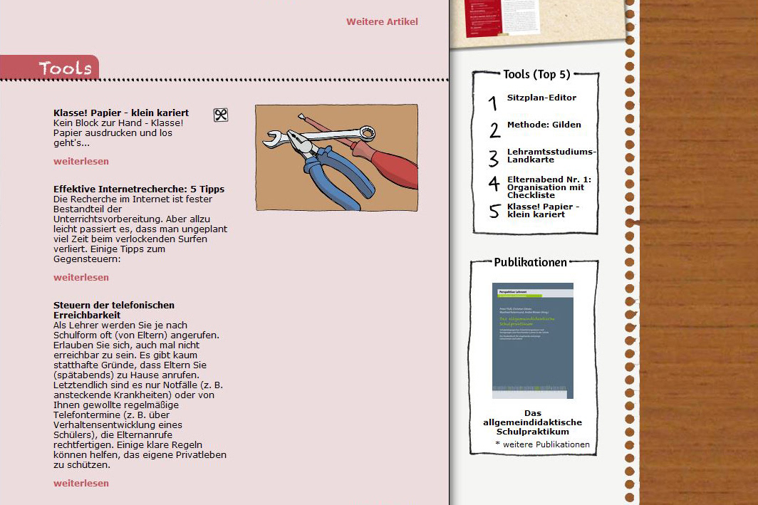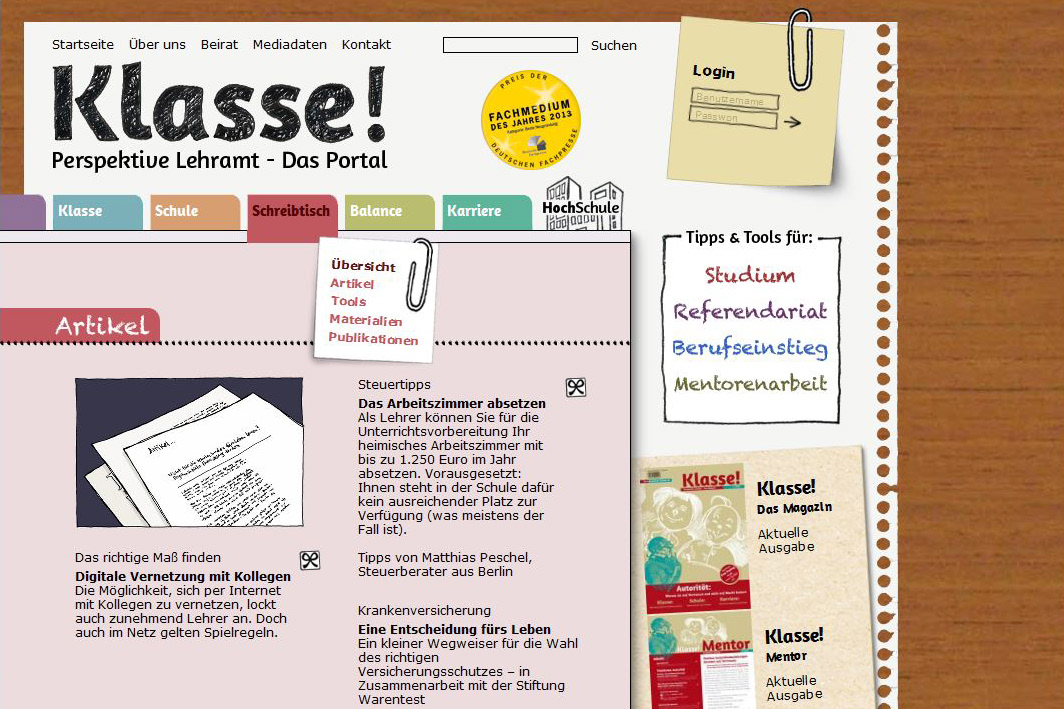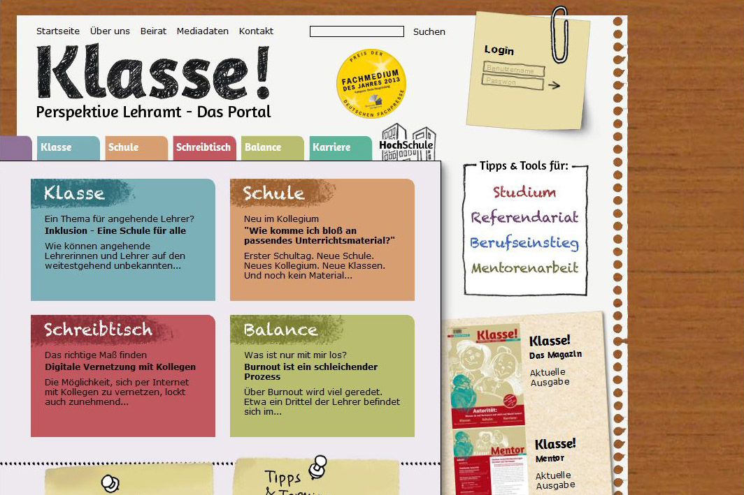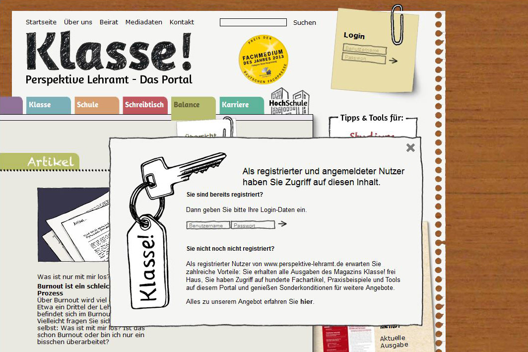 Web design and illustrations for “Klasse! Perspektive Lehramt”, a platform that offers professional information and educational material for prospective and young teachers as well as for their mentors. Publisher: Dr. Josef Raabe Verlags-GmbH.