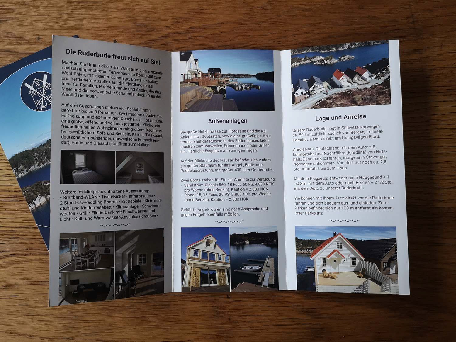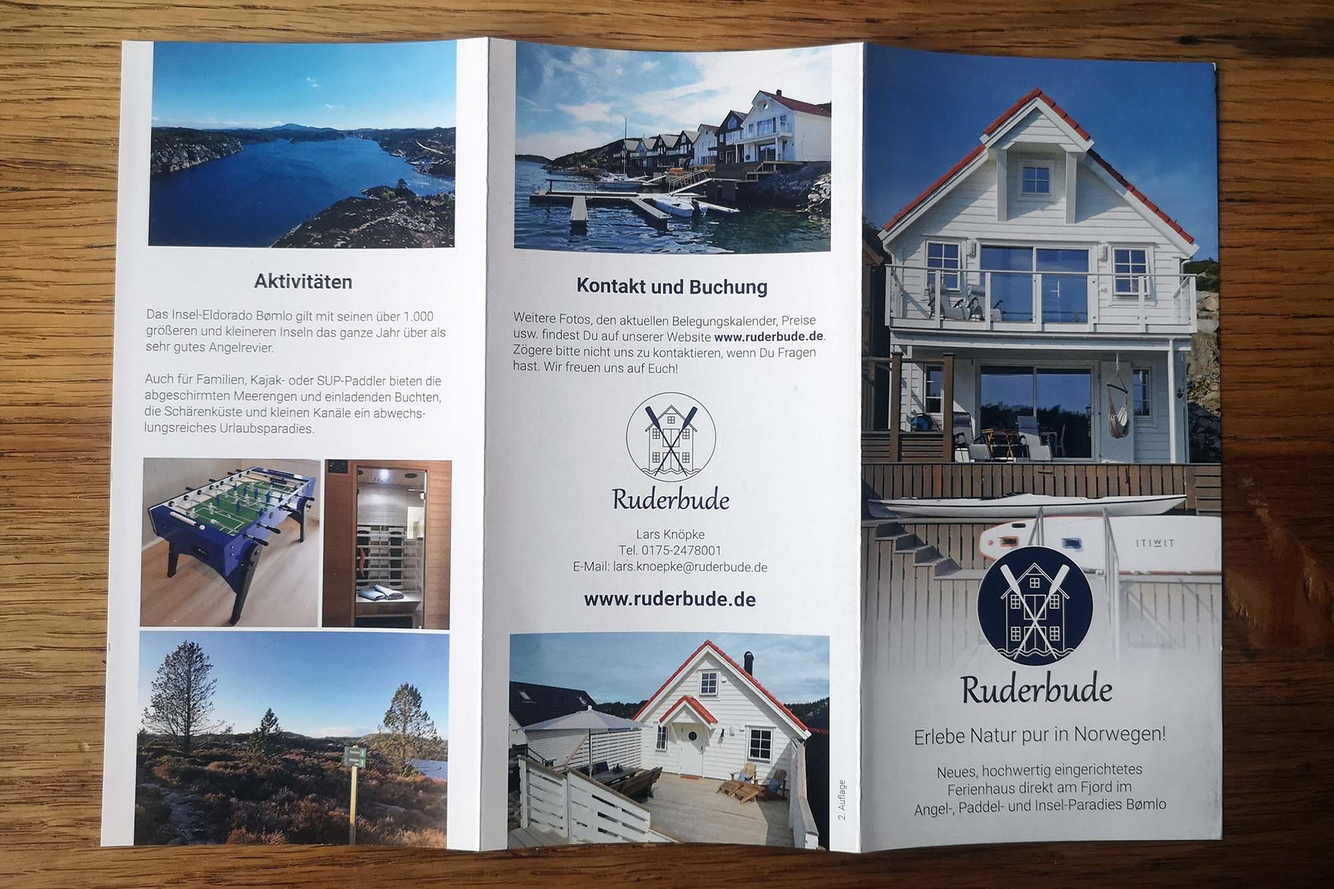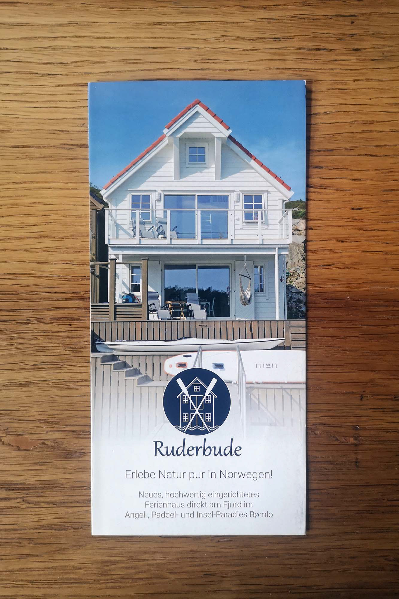 Design of the logo and flyers (2nd edition above, 1st edition below) for a holiday home for rent on a fjord in Norway. www.ruderbude.de