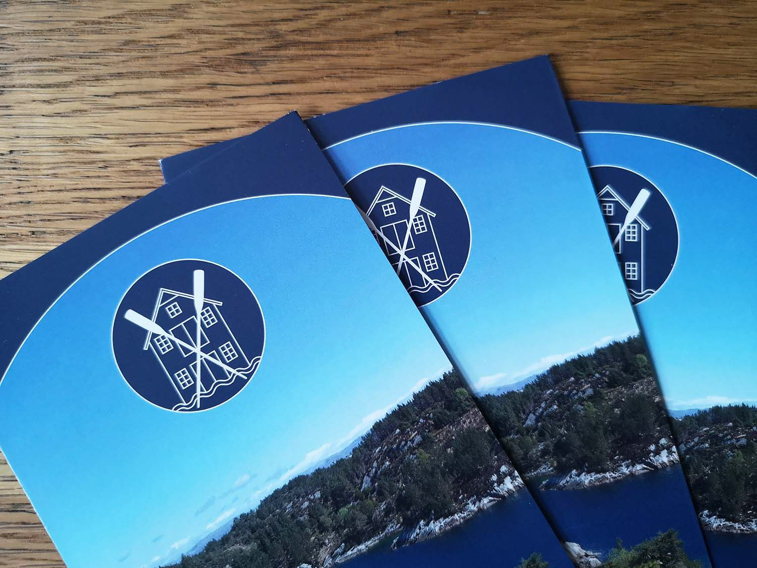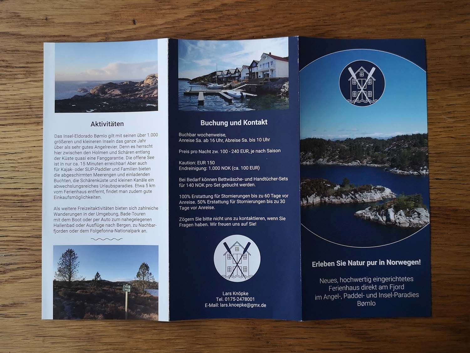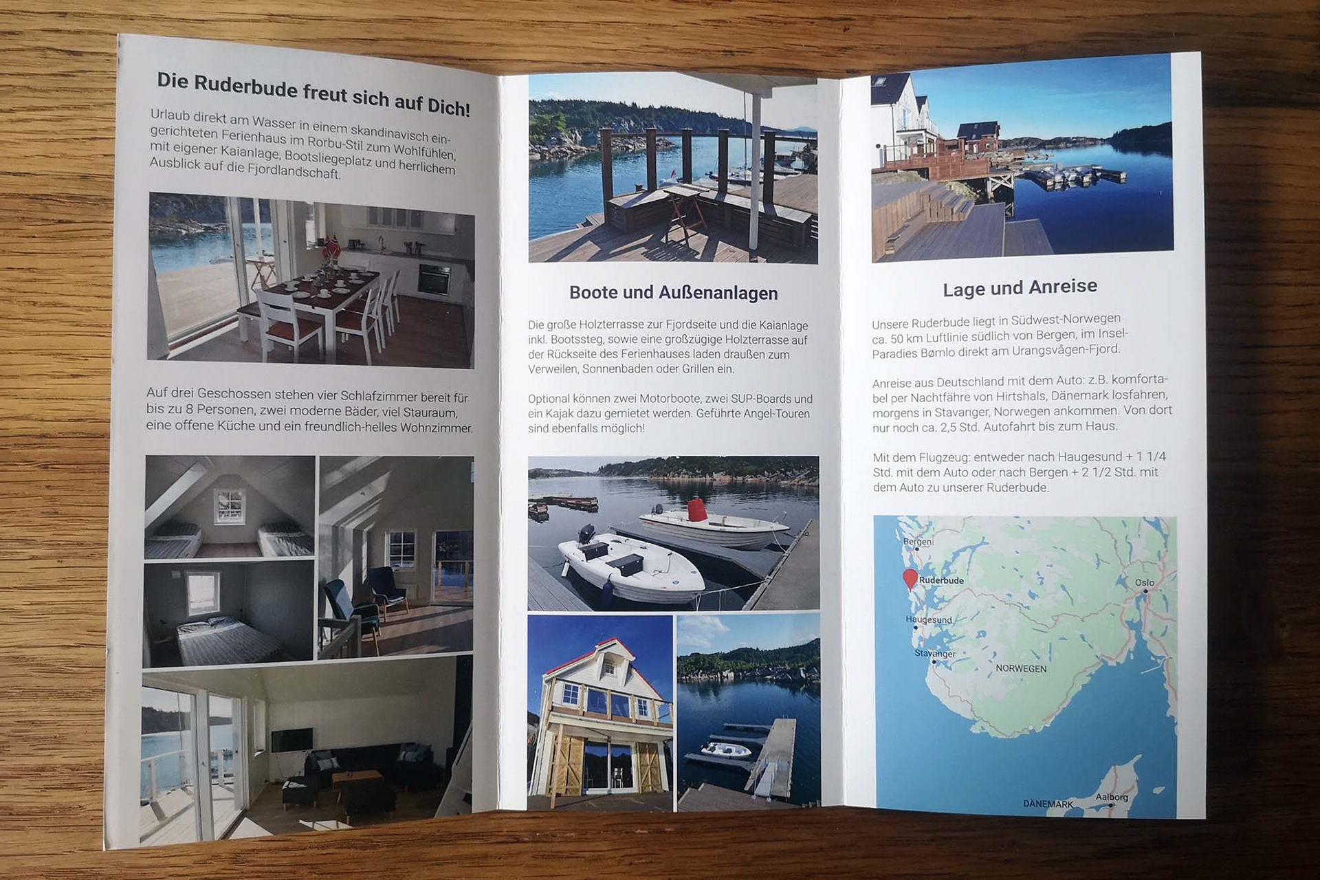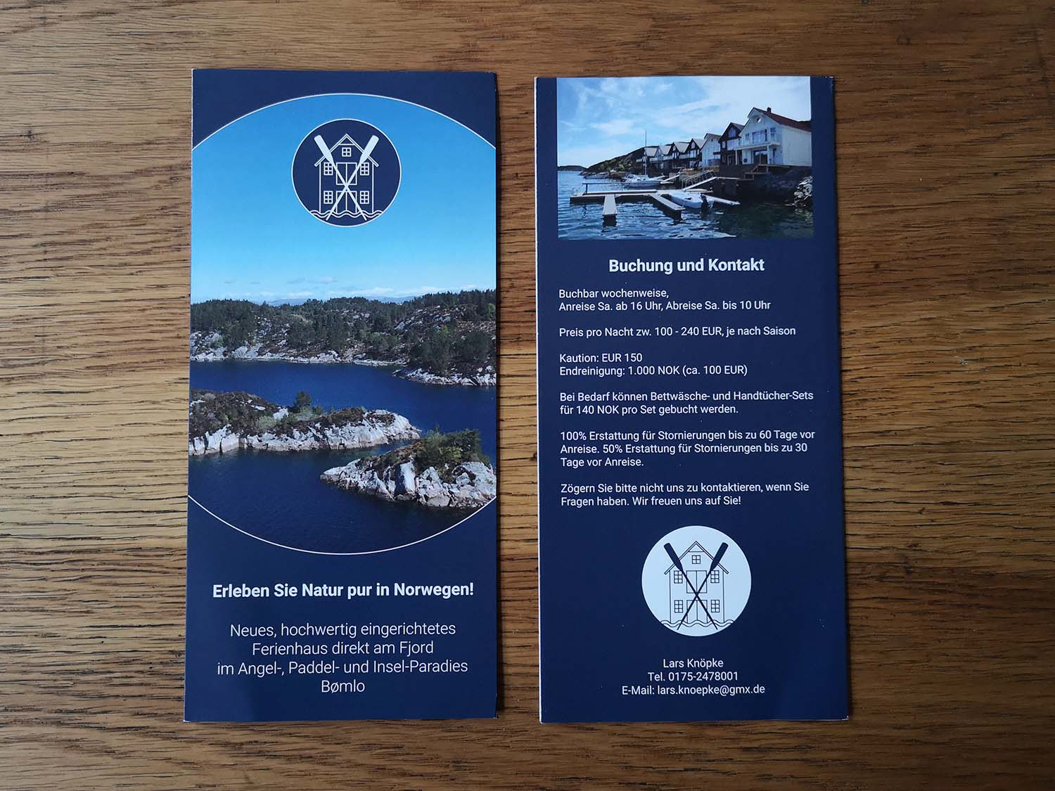 Design of the logo and flyers (2nd edition above, 1st edition below) for a holiday home for rent on a fjord in Norway. www.ruderbude.de