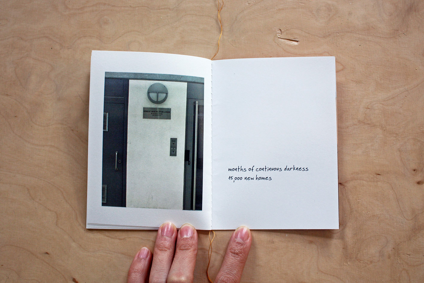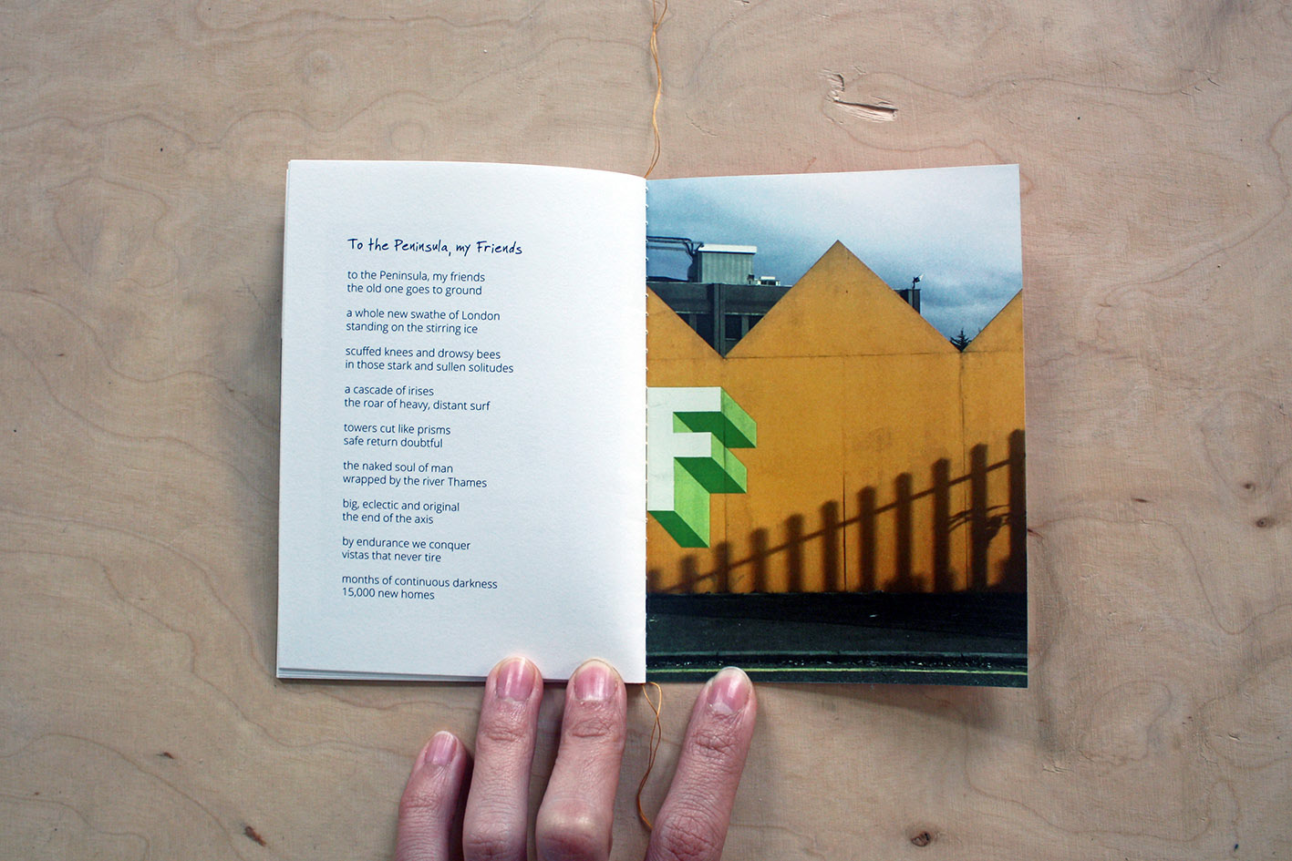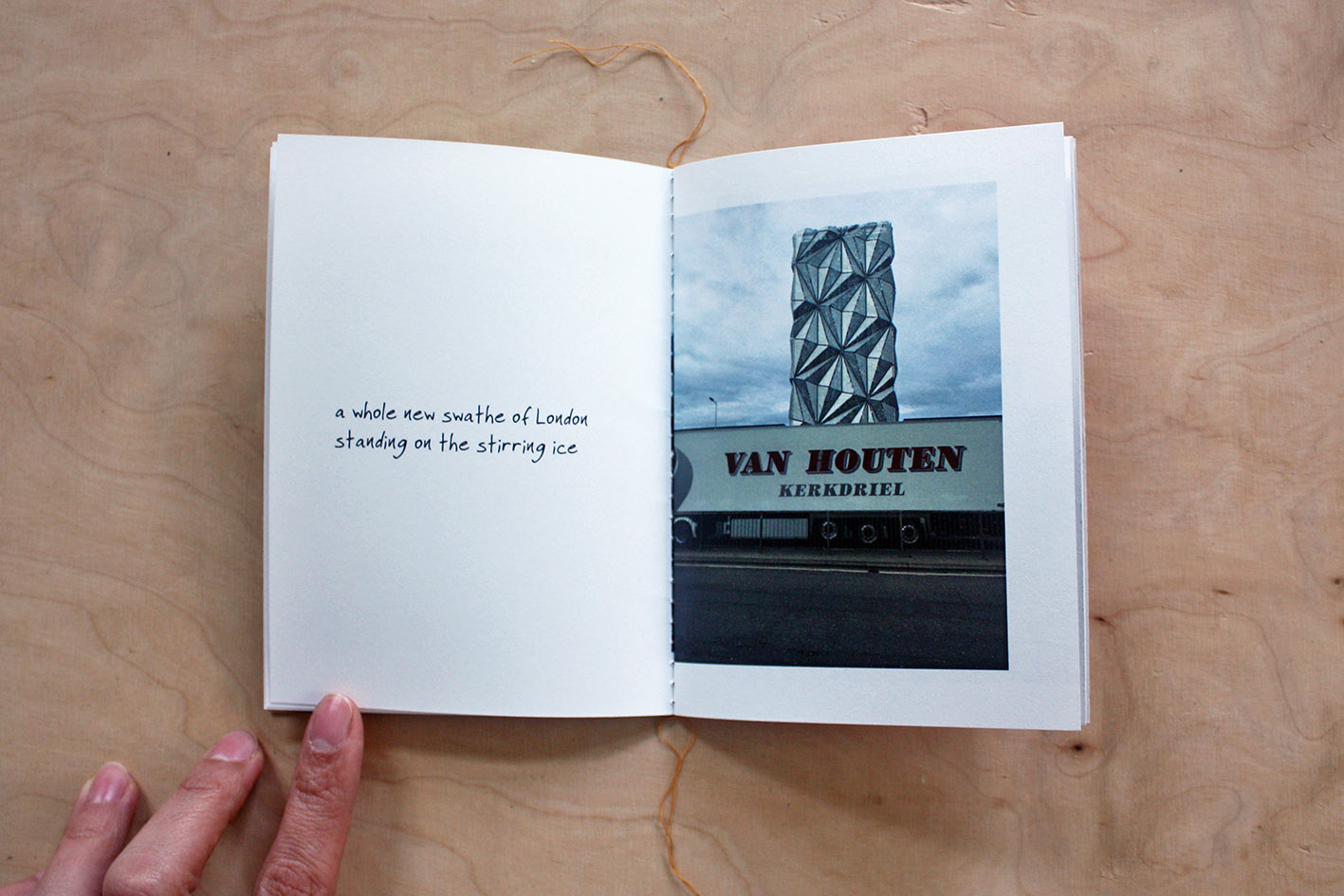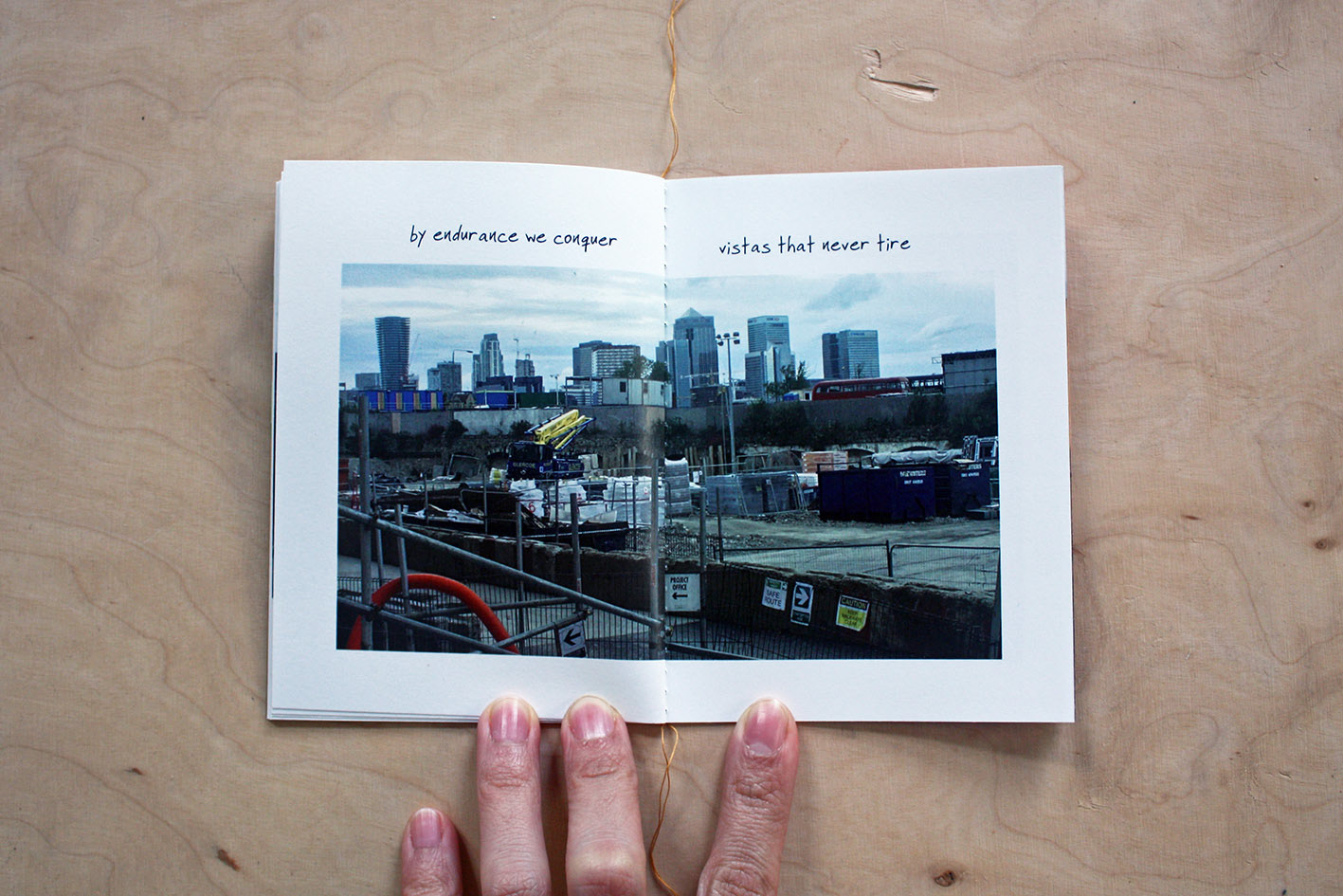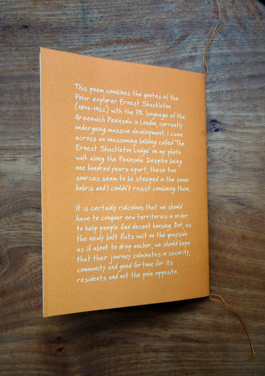 “It is a poem with photographs taken on a walk along the Greenwich Peninsula in London, currently undergoing massive development. Having grown up in Greenwich, since childhood I have often walked eastwards along the river and witnessed the many changes to the landscape and use. On this occasion, I spotted a very unassuming building called ‘The Ernest Shackleton Lodge’, tucked amongst the newer higher-rise flats. Intrigued by the contrast and possible connection between Shackleton and the newly developed Peninsula, I decided to combine the quotes of the polar explorer with the sales language of the Greenwich Peninsula PR. Though one hundred years apart, these two sources seem to be steeped in the same hubris, pioneering new territories but for whom?”