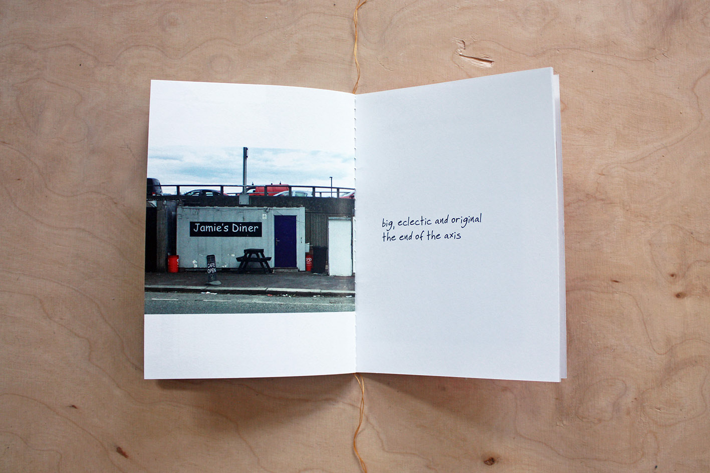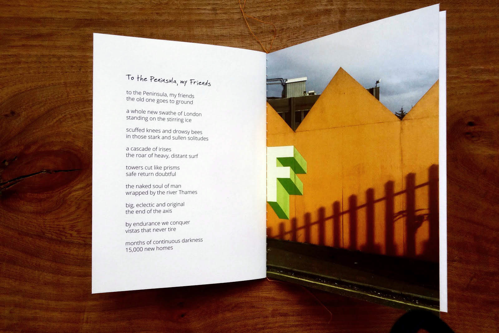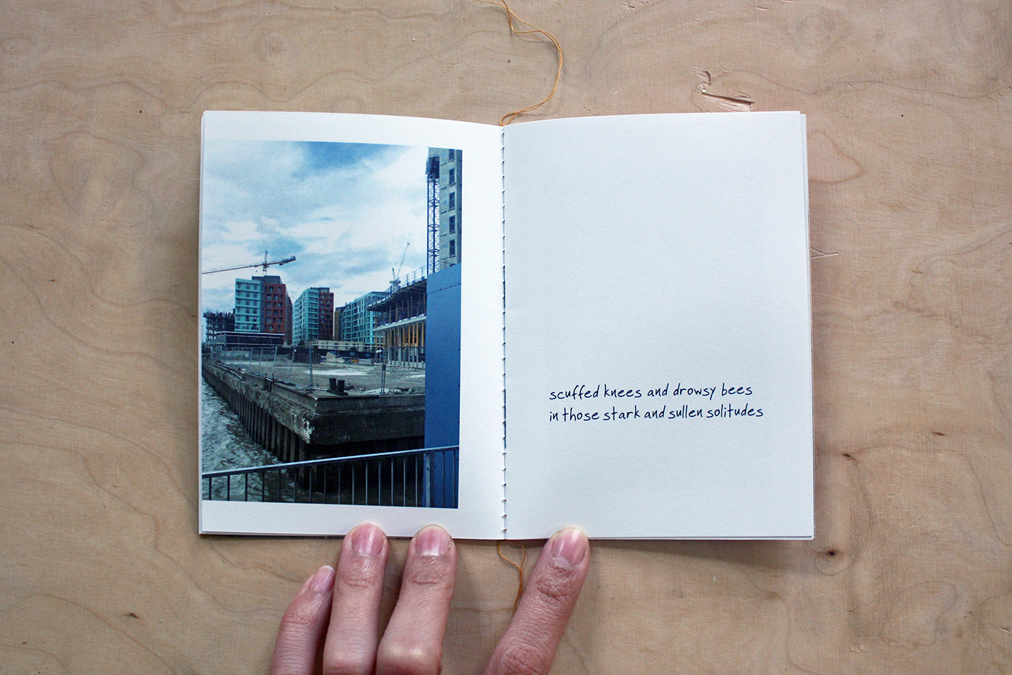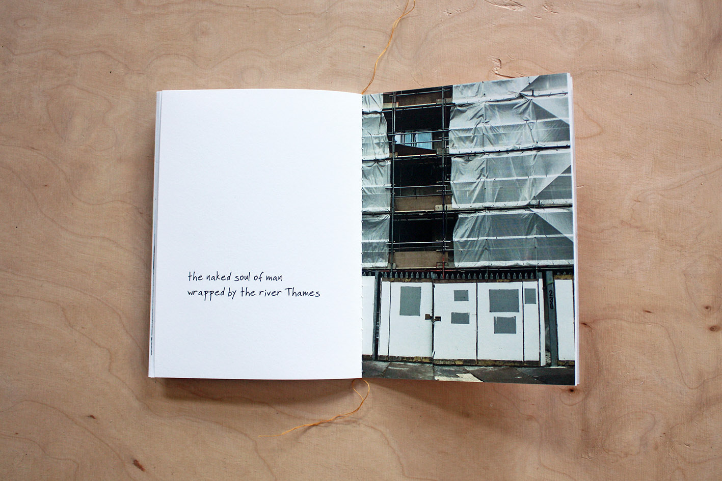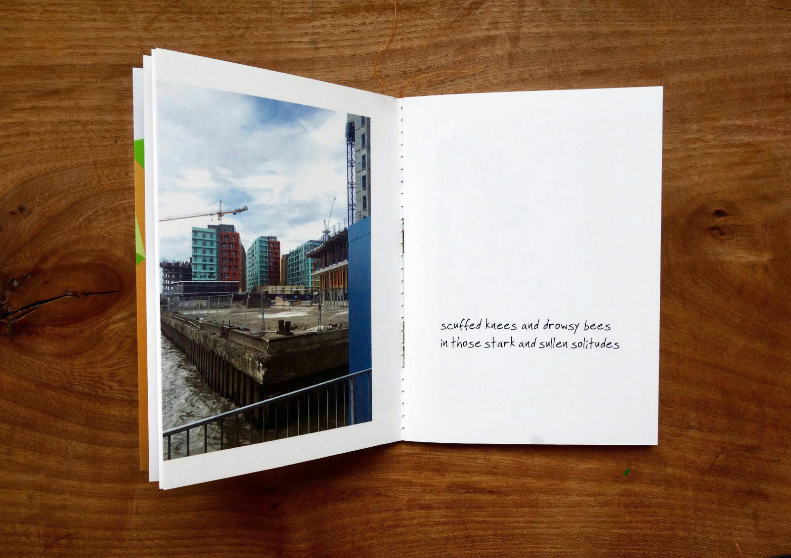 “It is a poem with photographs taken on a walk along the Greenwich Peninsula in London, currently undergoing massive development. Having grown up in Greenwich, since childhood I have often walked eastwards along the river and witnessed the many changes to the landscape and use. On this occasion, I spotted a very unassuming building called ‘The Ernest Shackleton Lodge’, tucked amongst the newer higher-rise flats. Intrigued by the contrast and possible connection between Shackleton and the newly developed Peninsula, I decided to combine the quotes of the polar explorer with the sales language of the Greenwich Peninsula PR. Though one hundred years apart, these two sources seem to be steeped in the same hubris, pioneering new territories but for whom?”